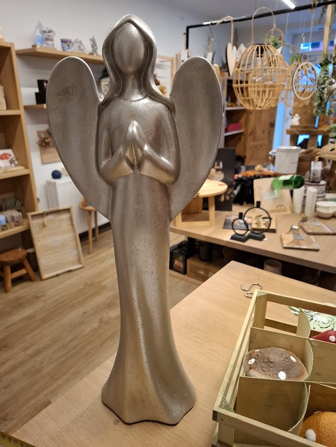 Dieser edle silberne Engel verleiht jedem Raum eine ganz besondere Atmosphäre. Mit seiner beeindruckenden Höhe von 50cm ist er ein Blickfang auf jedem Sideboard, Fensterbrett oder festlich gedeckten Tisch.