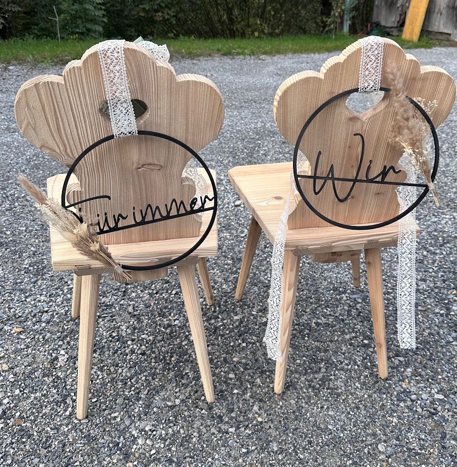 Diese handgefertigten Ringe wurden in unserer Alpenstil-Werkstatt mit viel Liebe zum Detail gefertigt. Mit den Schriftzügen „Für immer“ und „Wir“ sind sie die perfekte Wahl für romantische Hochzeiten. Ob als Stuhldekoration, Wanddeko oder als stilvolles Wohnaccessoire – unsere Alpenstil-Dekor-Ringe sind echte Unikate, die Wärme und Natürlichkeit ausstrahlen.