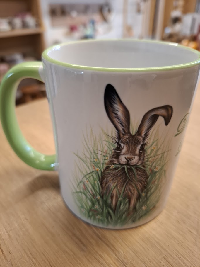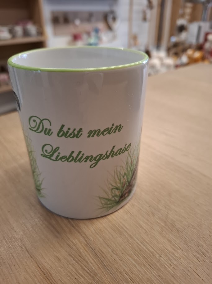 Die Tasse zeigt auf der Vorderseite einen süßen Hasen, der im Gras sitze, und auf der Rückseite die Rückansicht eines Hasen – ebenfalls im grünen Gras. Der grüne Henkel und der farblich passende Tassenrand verleihen dem Design einen frischen, natürlichen Look.