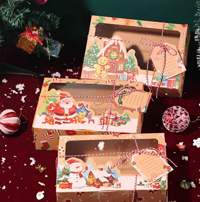 3Stück, Weihnachts-Kraftpapierboxen mit Santa Claus Motiv, ‚Frohe Festtage‘ Geschenkverpackung inkl. DIY-Anhänger & transparentem Fenster – Partygeschenke für kleine Präsente & Deko zum Weihnachtsfest.