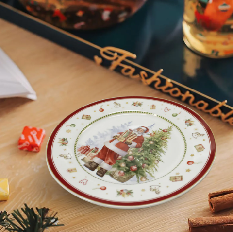 Bringen Sie den Zauber von Weihnachten auf den Tisch mit unserem Weihnachts-Dessertteller im Vintage-Stil. Dieser Teller aus feinem Bone China-Porzellan ist das Symbol für Eleganz und Tradition. Der Druck zeigt einen freundlichen Weihnachtsmann mit Geschenken neben einem majestätischen Weihnachtsbaum. Der Rand ist fein mit weihnachtlichen und festlichen Motiven verziert.